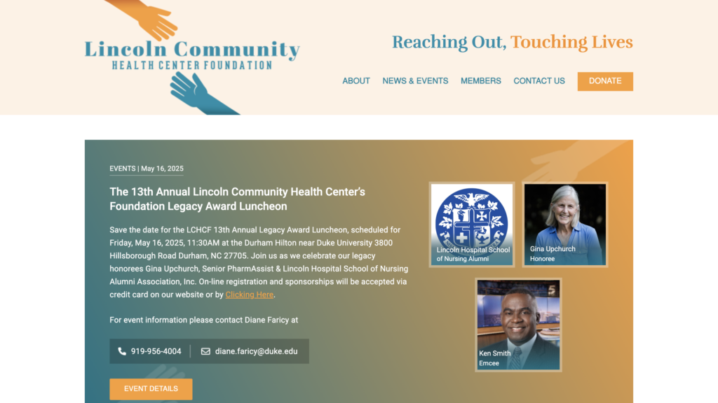 The Lincoln Community Health Center Foundation, Inc. is a 501 (c) 3 nonprofit organization whose vision is to become Lincoln Community Health Center’s primary ambassadors by fostering partnerships through fundraising, education and engaging donors. Our mission is to enhance the quality of health and improve access to healthcare in Durham and surrounding areas. The Foundation was incorporated in 2008 under the guidance of Joyce C. Nichols, PA and other community leaders. All funds raised help support patient services at Lincoln Community Health Center.