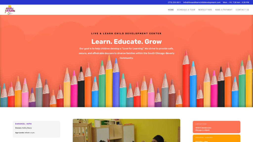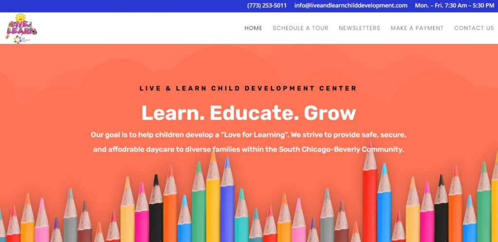 Live and Learn Child Development Center’s mission is to provide safe, secure, and affordable daycare to diverse families within the South Chicago-Beverly Community. We provide a wide range of age-appropriate learning opportunities for children from ages 6 weeks to 6 years old, to develop and grow intellectually, socially, and emotionally.