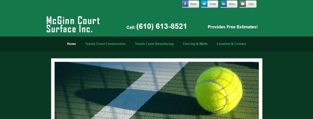Count on the experts at McGinn Court Surface Inc. to take care of your tennis court needs. We are located in Gradyville, Pennsylvania, and provide a wide variety of tennis court construction services. A family business since 1899, we pride ourselves in dependable, high quality workmanship at fair prices. We fully guarantee our work and provide free estimates in a timely manner.