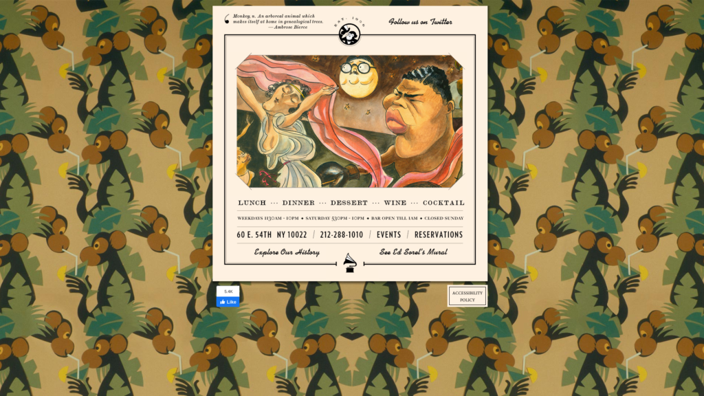 Known as a comfortable locale to while away an afternoon with an im-promptu companion, the new bar at the Elysee – known to some customers, between drinks, as the “easy lay” –would become the New York home of Tallulah Bankhead and the site of a number of historically significant events during its lifetime, such as the untimely death of Tennessee Williams, when the play wright mysteriously chocked on an eye-dropper. For decades, the Monkey bar provided a cozy outpost for admen in bespoke suits, after-hours politicians, and media barons looking for a little fun.
