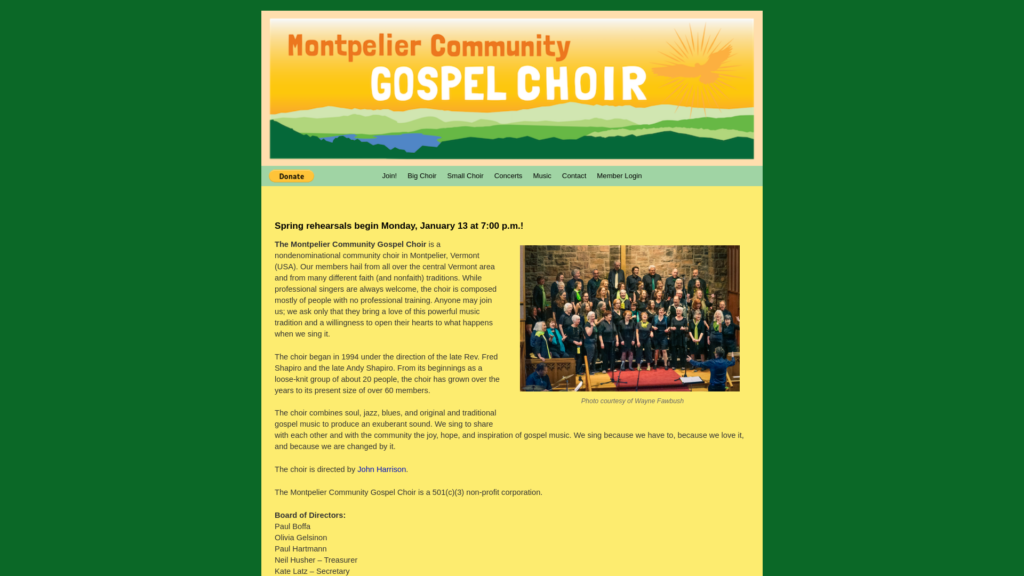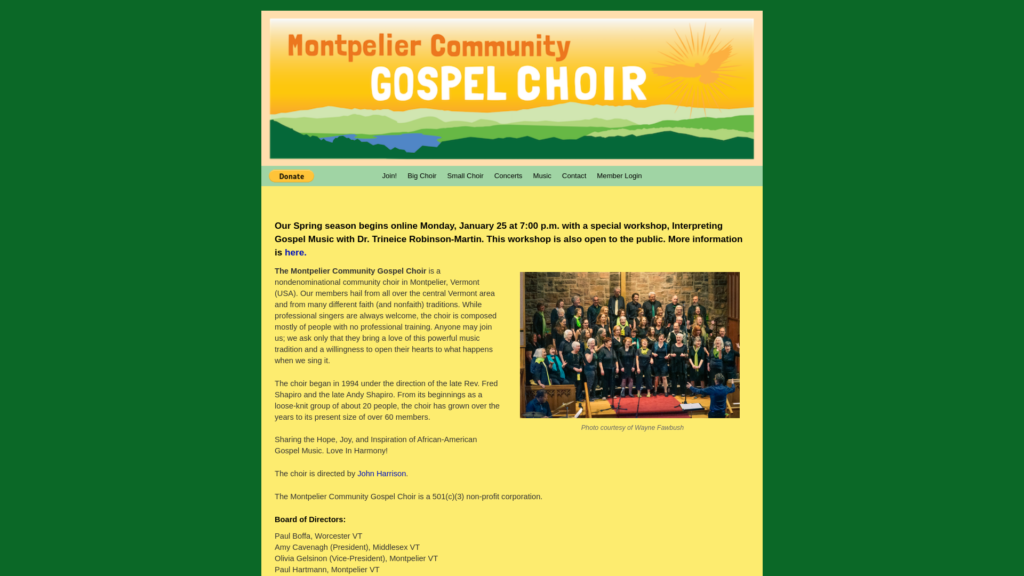 The Montpelier Community Gospel Choir is a nondenominational community choir in Montpelier, Vermont (USA). Our members hail from all over the central Vermont area and from much different faith (and nonfaith) traditions. While professional singers are always welcome, the choir is composed mostly of people with no professional training. Anyone may join us; we ask only that they bring a love of this powerful music tradition and a willingness to open their hearts to what happens when we sing it.