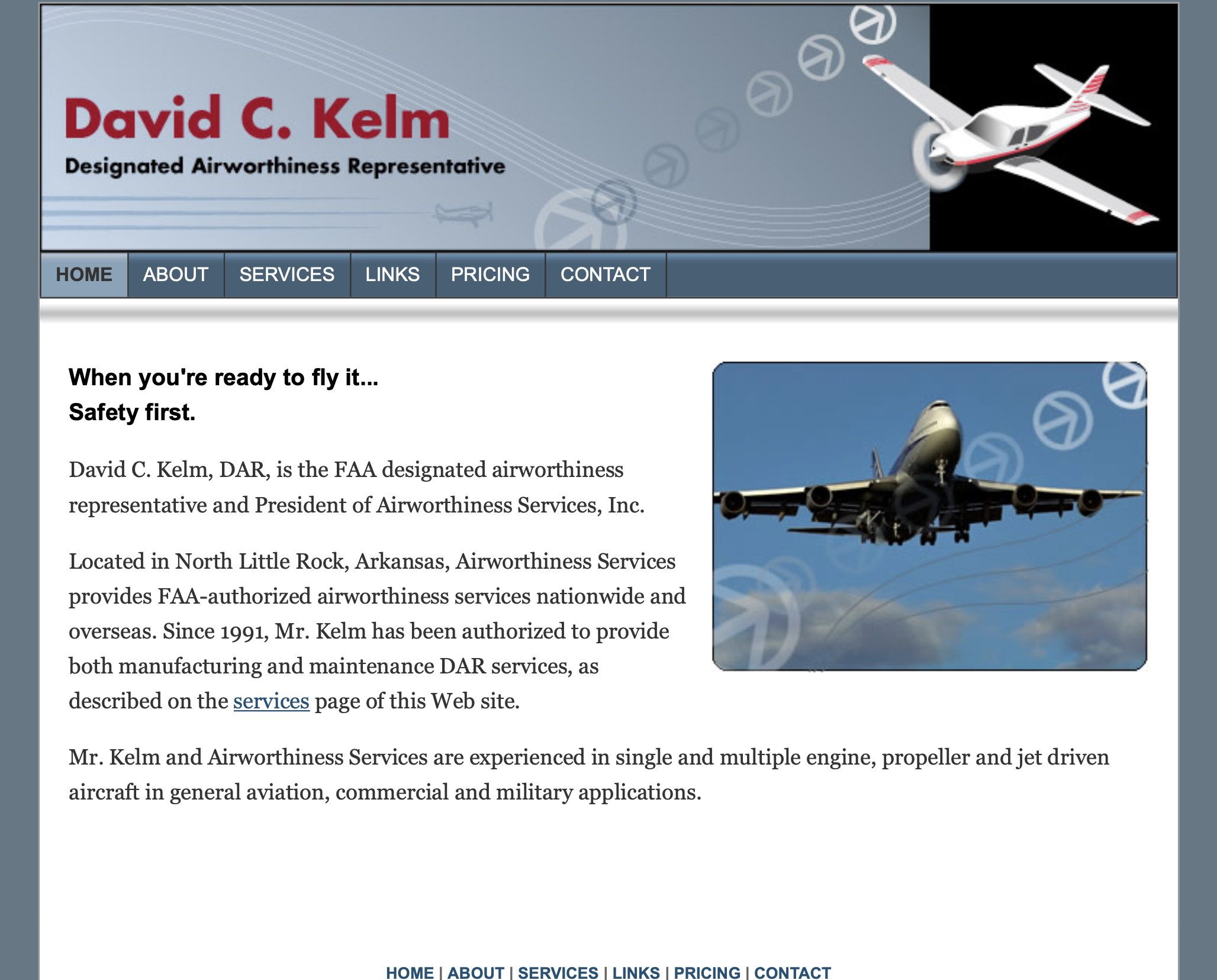 Located in North Little Rock, Arkansas, Airworthiness Services provides FAA-authorized airworthiness services nationwide and overseas. Since 1991, Mr. Kelm has been authorized to provide both manufacturing and maintenance DAR services, as described on the services page of this Web site.