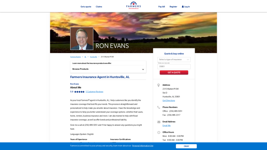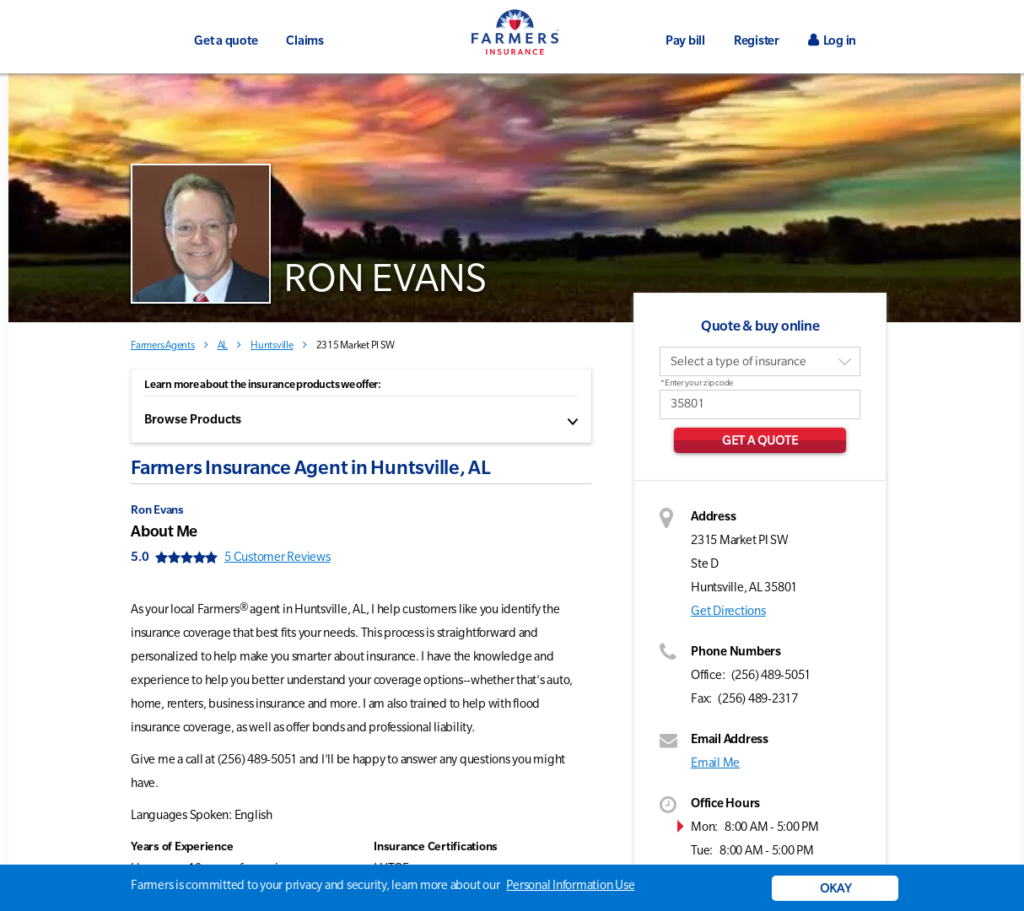 As your local FarmersĀ® agent in Huntsville, AL, I help customers like you identify the insurance coverage that best fits your needs. This process is straightforward and personalized to help make you smarter about insurance. I have the knowledge and experience to help you better understand your coverage options–whether that’s auto, home, renters, business insurance, and more. I am also trained to help with flood insurance coverage, as well as offer bonds and professional liability.