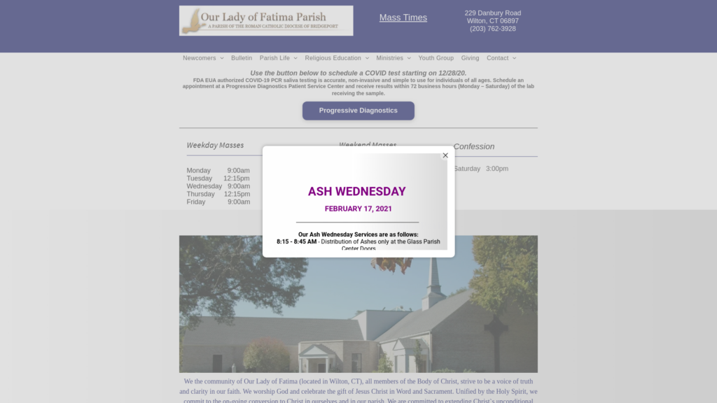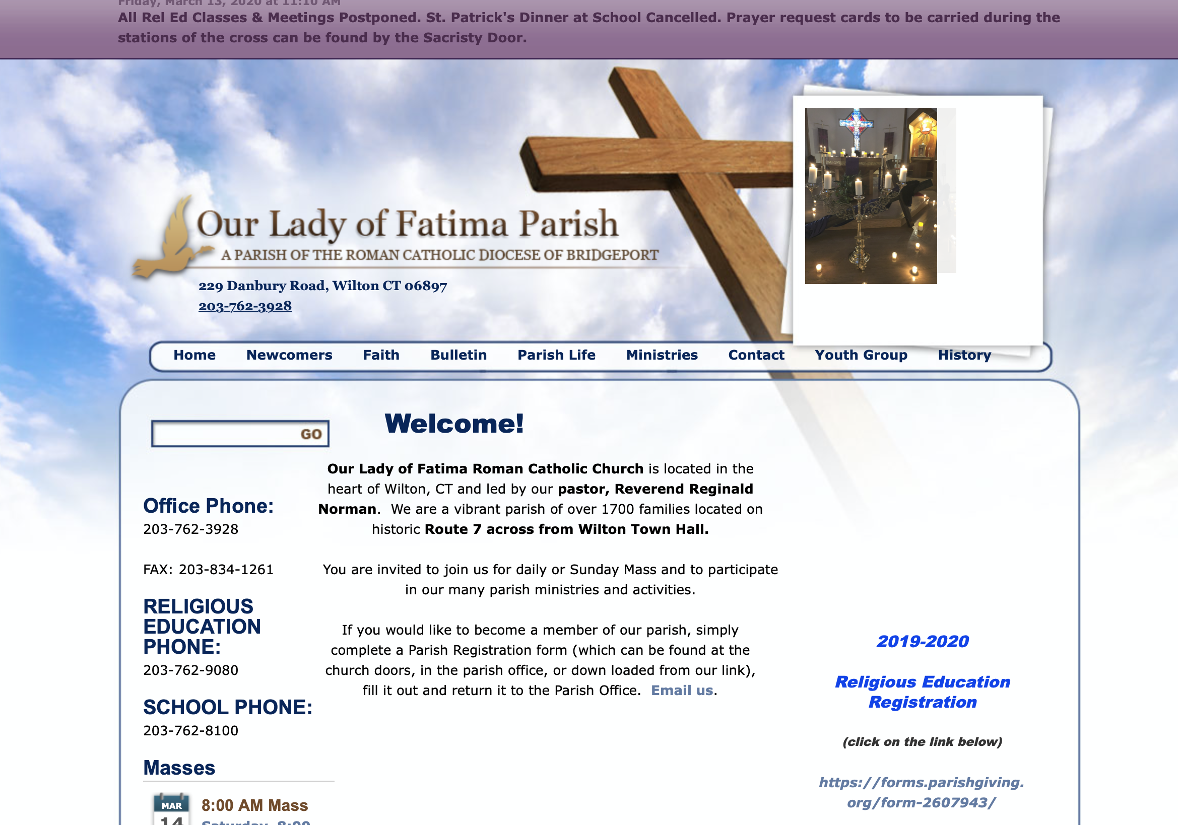 Our Lady of Fatima Roman Catholic Church is located in the heart of Wilton, CT and led by our pastor, Reverend Reginald Norman. We are a vibrant parish of over 1700 families located on historic Route 7 across from Wilton Town Hall.