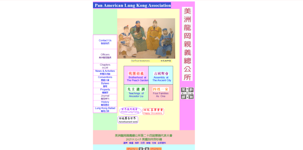 The Lung Kong Association is an apolitical, non‑sectarian, charitable organization. It was founded to foster the brotherhood of four families: Lau, Kwan, Cheung and Chiu. It is a fraternal organization established in North America at the end of the nineteenth century by Chinese immigrants with those family names. Its aims were, and still are, to help fellow members, to assist newcomers to settle in the new country and to promote Chinese culture in the mainstream society.