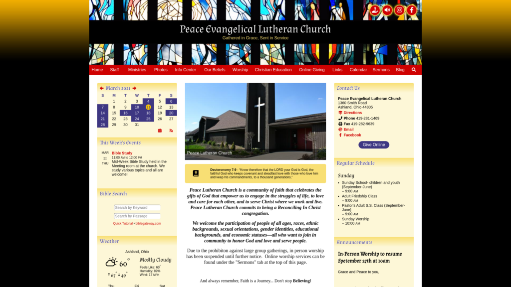 Peace Lutheran Church is a community of faith that celebrates the gifts of God that empower us to engage in the struggles of life, to love and care for each other, and to serve Christ where we work and live. Peace Lutheran Church commits to being a Reconciling In Christ congregation.