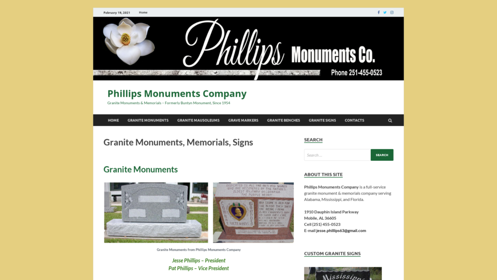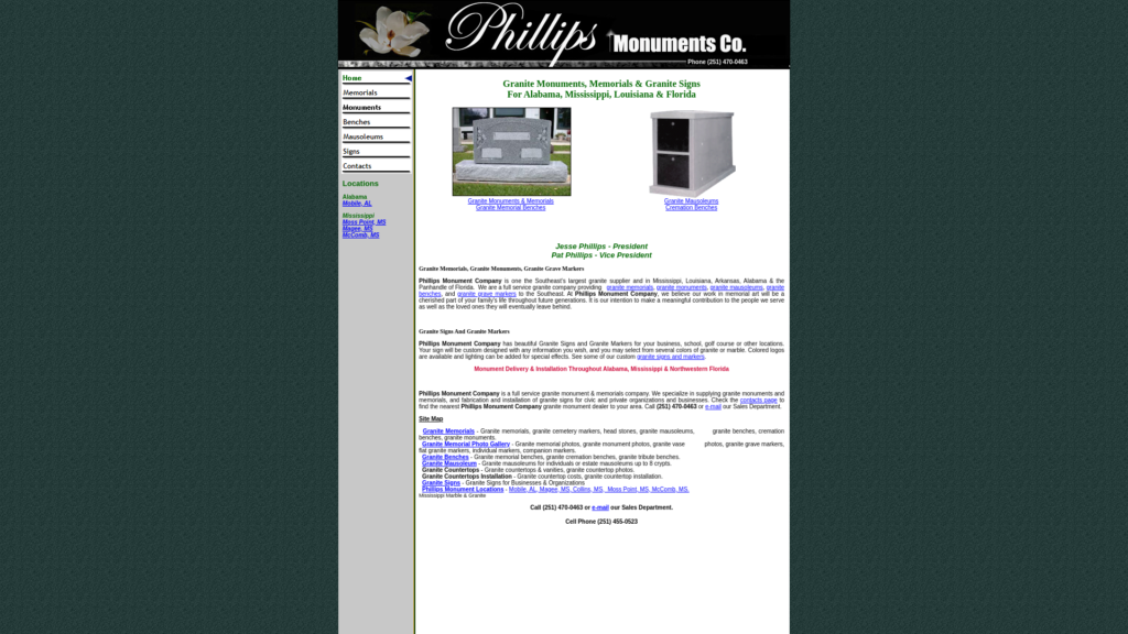 Granite Monuments, Memorials, Signs by Phillips Monuments Company of Mobile, Alabama serving Alabama, Mississippi and Florida.