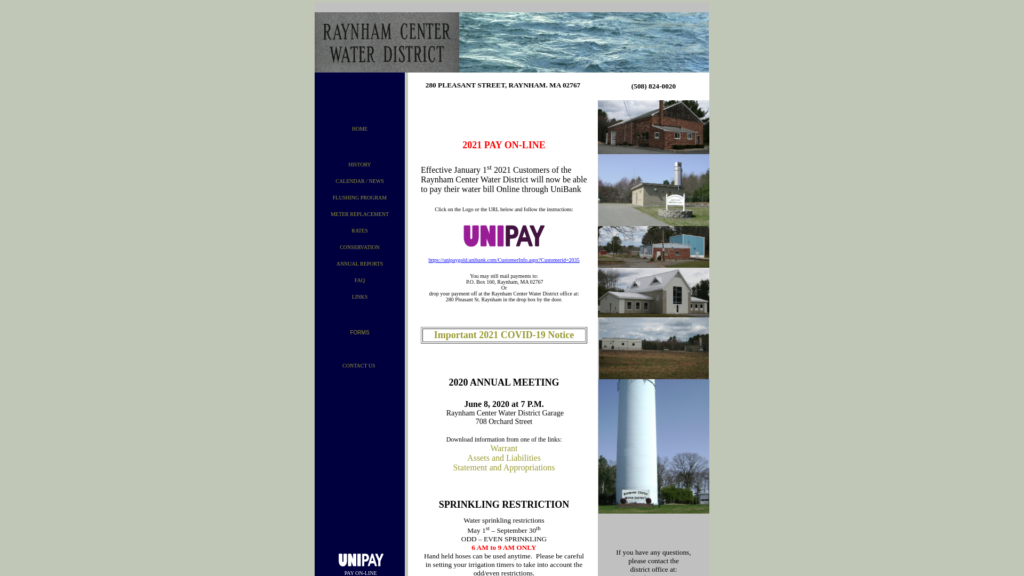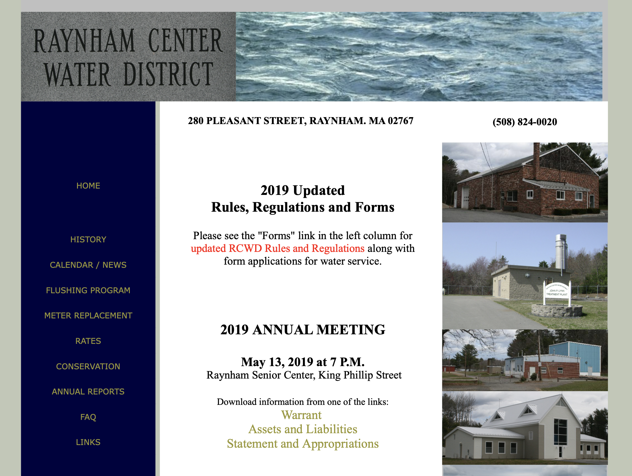 The Raynham Center Water District was established by an Act of the Massachusetts State Legislature in the year 1947. This act set the original boundaries of the district and also granted elected water commissioners to oversee the district. Specific sections of the Act give the district the rights of eminent domain, taxation, and the setting of fees and water rates.