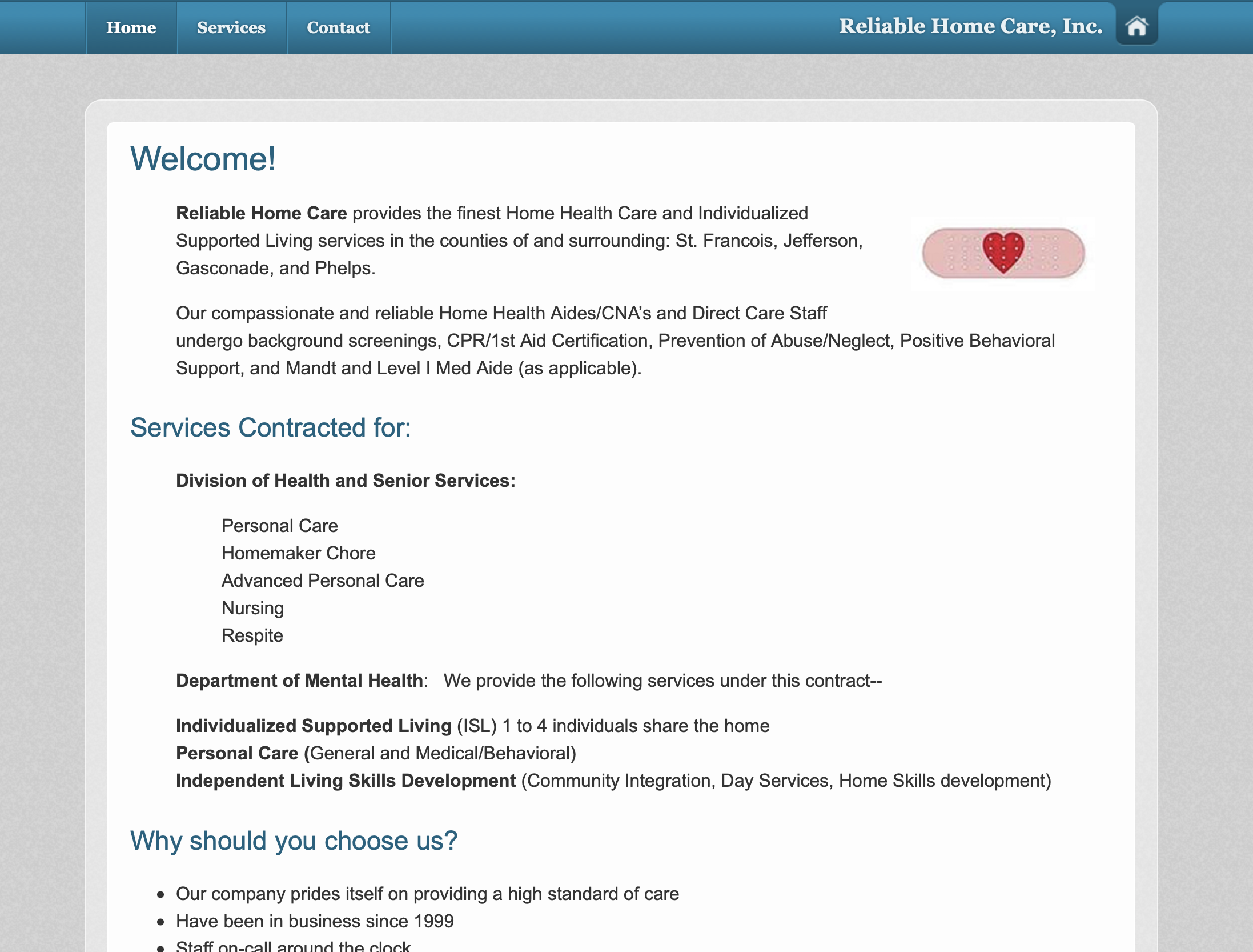 Home. Reliable Home Care provides the finest Home Health Care and Individualized Supported Living services in the Missouri counties of and surrounding: St. Francois, Jefferson, St. Charles, Gasconade, Maries, Franklin, Phelps, and Camden.