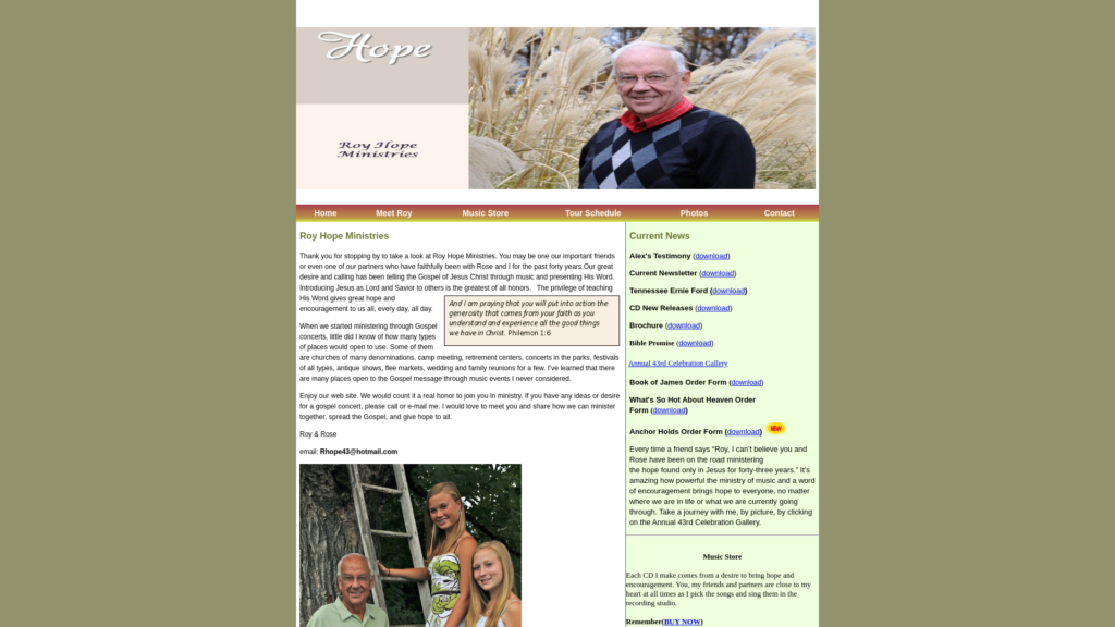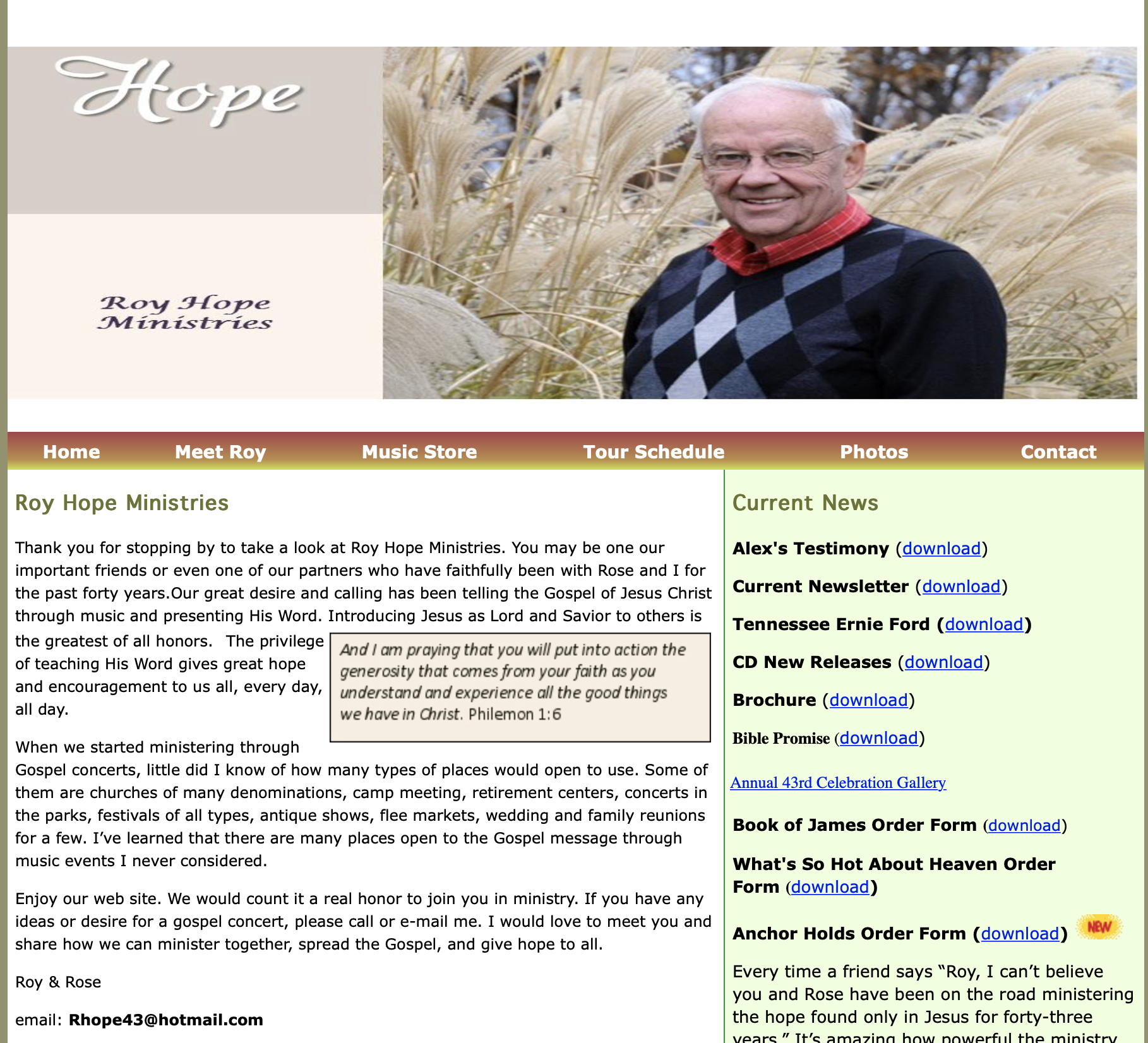 Thank you for stopping by to take a look at Roy Hope Ministries. You may be one of our important friends or even one of our partners who have faithfully been with Rose and me for the past forty years. Our great desire and calling has been telling the Gospel of Jesus Christ through music and presenting His Word. Introducing Jesus as Lord and Savior to others is the greatest of all honors. The privilege of teaching His Word gives great hope and encouragement to us all, every day, all day.