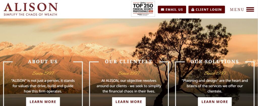 All by itself, surrounded by nothing but the vast New Zealand landscape of mountains and water, the Wanaka Tree sprouted and grew. It has not only survived, but thrived, in an environment that most would say could not possibly sustain its life. It did this alone, and it did it in a very beautiful way. Much like this tree, Alison has found a way to bring triumphs out of struggles. She has committed her professional life to helping clients do the same thing – helping them push through challenges, live their life to the fullest, and leave a legacy for the generations to come.