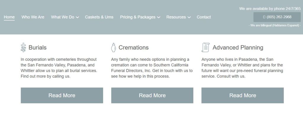 The passing of a loved one is a difficult time. The process of planning their ceremony and place of rest shouldn’t be. Southern California Funeral Directors, Inc. takes care of the busy work so you can grieve in peace. Our partnerships with chapels and cemeteries throughout Pasadena, The San Fernando Valley, and Whittier allow our funeral directors handle the logistics of burial and cremation so you don’t have to.