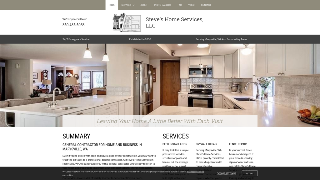 When you’ve made the decision to hire a general contractor for home and business repairs, room additions, kitchen remodeling, a fence and gate, home repairs and maintenance near Marysville, WA, or the surrounding area, give Steve’s Home Services a call today. We’ll do our best to implement your specifications and give you the property that you’ve always envisioned.