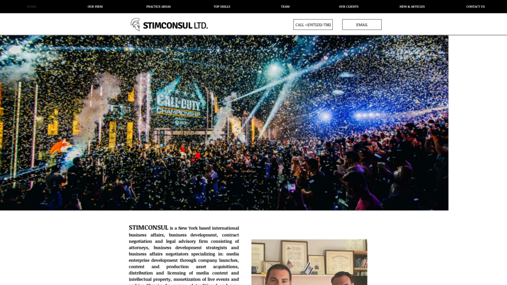 STIMCONSUL is a New York-based international business affairs, business development, contract negotiation, and legal advisory firm consisting of attorneys, business development strategists, and business affairs negotiators specializing in media enterprise development through company launches, content and production asset acquisitions, distribution and licensing of media content and intellectual property, monetization of live events and archive libraries by means of traditional and new technologies throughout the world, and protection of ownership rights.