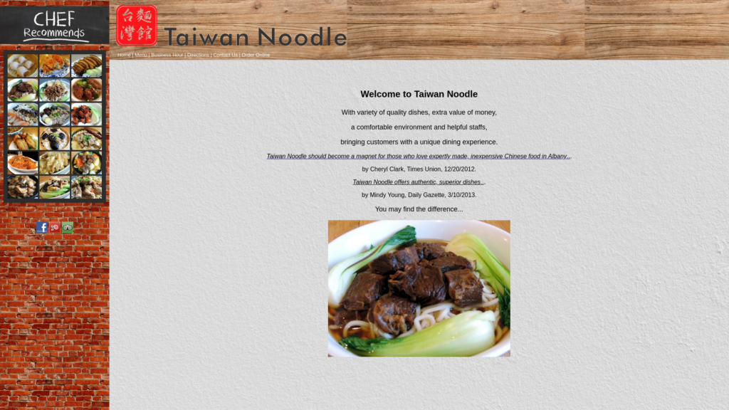 Welcome to Taiwan Noodle. With variety of quality dishes, extra value of money, a comfortable environment and helpful staffs, bringing customers with a unique dining experience.