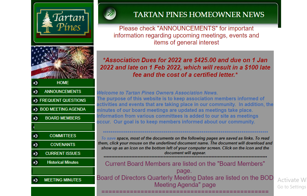 The purpose of the website is to keep association members informed of activities and events that are taking place in our community. In addition, the minutes of our board meetings are updated as meetings take place. Information from various committees is added to our site as meetings occur. Our goal is to keep members informed about our community.