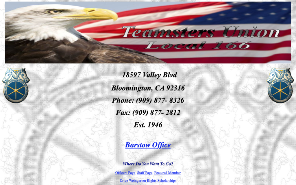 Teamster Union Local 166. 18597 Valley Blvd, Bloomington, CA 92316. Phone: (909) 877- 8326. Fax: (909) 877- 2812. Est. 1946.