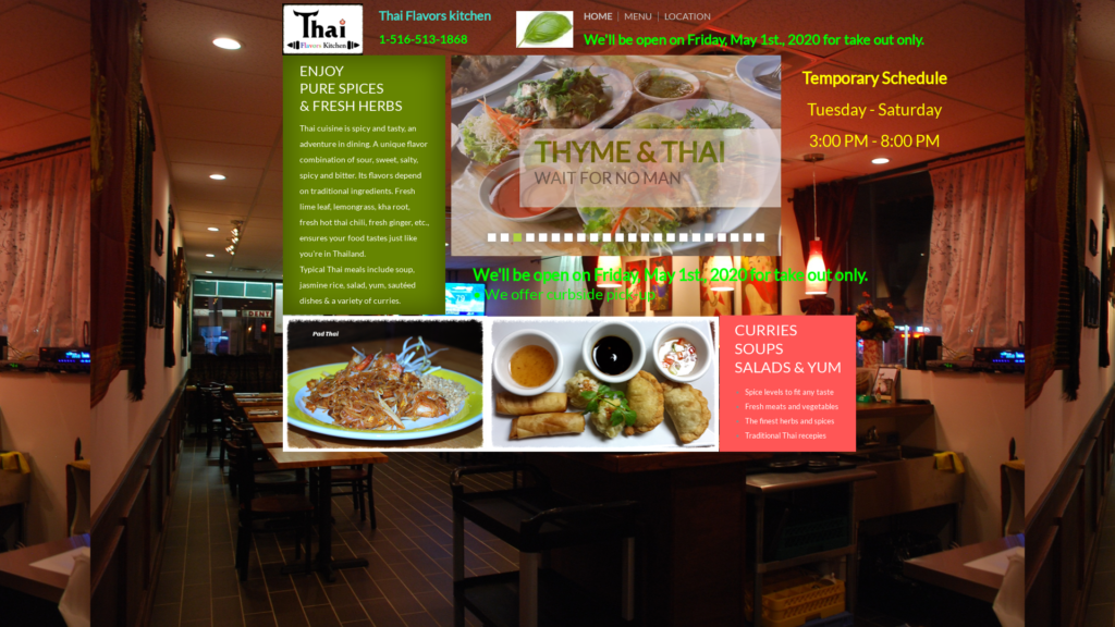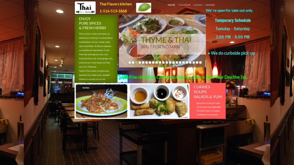 Thai cuisine is spicy and tasty, an adventure in dining. A unique flavor combination of sour, sweet, salty, spicy and bitter. Its flavors depend on traditional ingredients. Fresh lime leaf, lemongrass, kha root, fresh hot thai chili, fresh ginger, etc., ensures your food tastes just like you’re in Thailand.