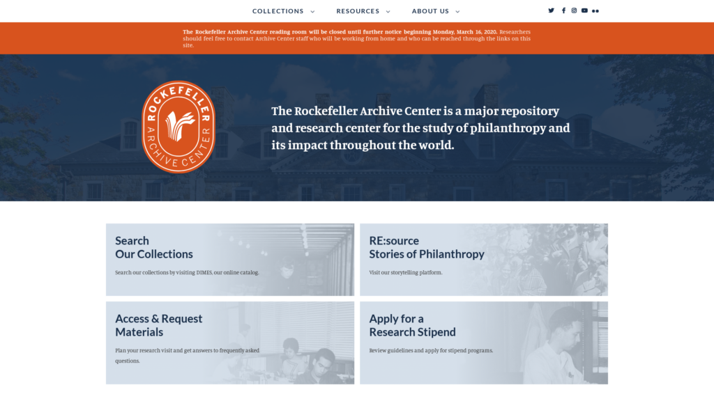 Rockefeller Archive Center | The Rockefeller Archive Center is a major repository and research center for the study of philanthropy and its impact throughout the world.
