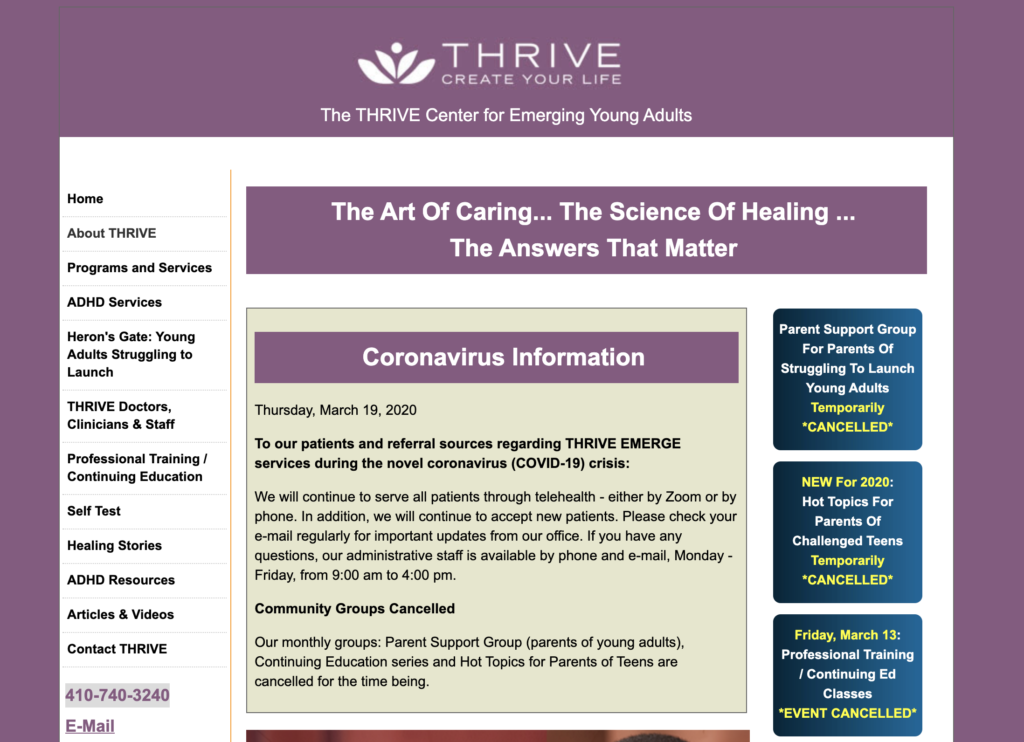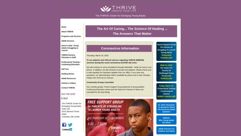 THRIVE Center provides comprehensive mental health services for emerging young adults, children, teens, young adults and adults, and specializes in ADHD, anxiety, executive functioning, depression. Parent support groups. Based in Columbia, Maryland.