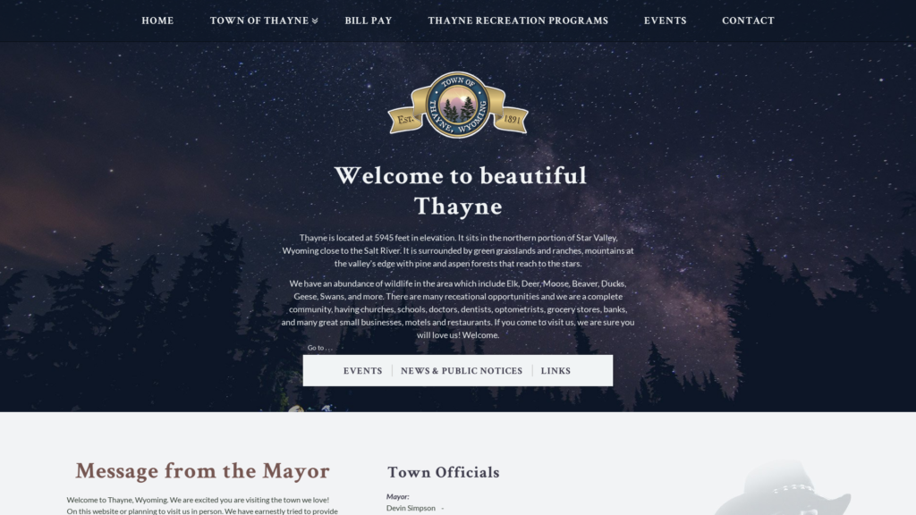 Thayne is located at 5945 feet in elevation. It sits in the northern portion of Star Valley, Wyoming close to the Salt River. It is surrounded by green grasslands and ranches, mountains at the valley’s edge with pine and aspen forests that reach to the stars.