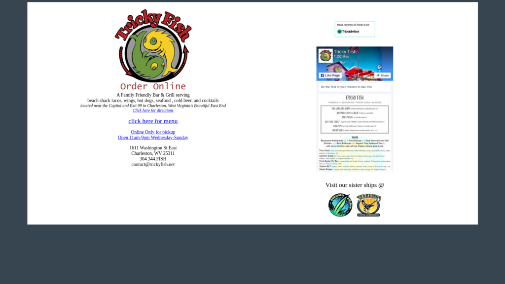 Tricky Fish is a family-friendly beach bar & grill marooned in Wild Wonderful West Virginia near the Capitol Complex. We feature Tacos, Burgers, Seafood, Wings, and WV Hot Bologna Sandwiches. We also have a good selection of local and micro-brewed beers and great Margaritas! You can order online for pickup as well!