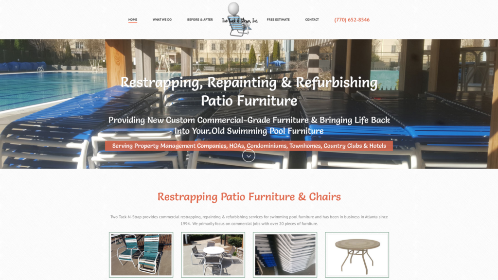 Two Tack-N-Strap provides commercial restrapping, repainting & refurbishing services for swimming pool furniture and has been in business in Atlanta since 1994. We primarily focus on commercial jobs with over 20 pieces of furniture.