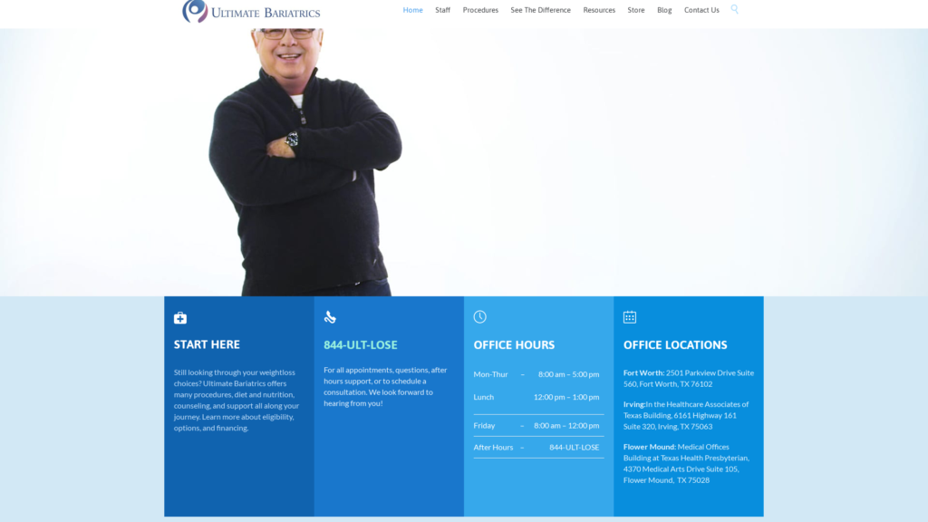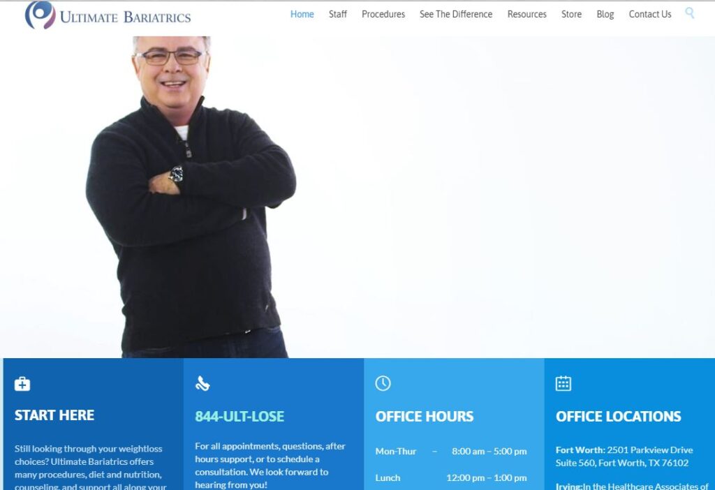 START HERE Still looking through your weightloss choices? Ultimate Bariatrics offers many procedures, diet and nutrition, counseling, and support all along your journey. Learn more about eligibility, options, and financing. [split] Resources → 844-ULT-LOSE For all appointments, questions, after ...