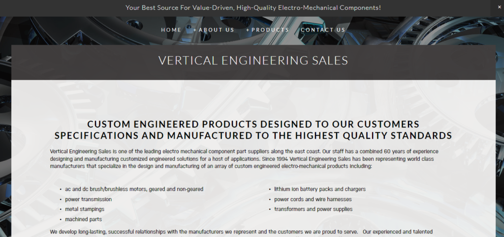 Vertical Engineering Sales is one of the leading electro mechanical component part suppliers along the east coast. Our staff has a combined 60 years of experience designing and manufacturing customized engineered solutions for a host of applications. Since 1994 Vertical Engineering Sales has been representing world class manufacturers that specialize in the design and manufacturing of an array of custom engineered electro-mechanical products including: