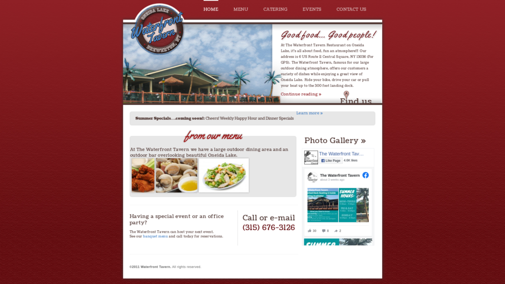 The Waterfront offers a variety of steaks, seafood, pasta, appetizers and food hot off the grill. Check out The Waterfront Tavern menu. We offer a variety of daily and weekly food and drink specials. Check out our Events link to see the latest specials and events!
