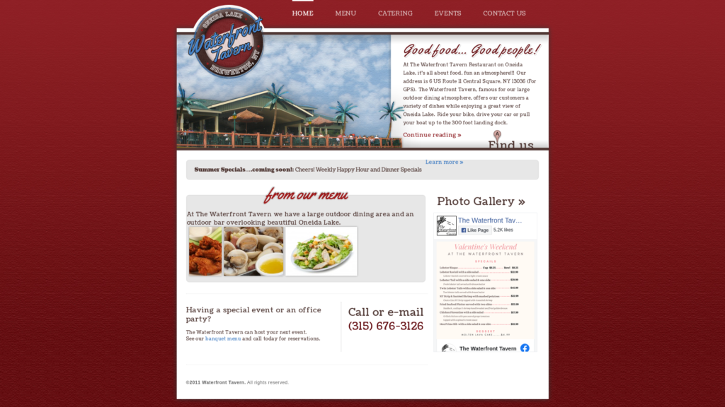 Waterfront Dining just north of Syracuse, NY. The Waterfront Tavern Restaurant on Oneida Lake, it’s all about food, fun an atmosphere!!! The Waterfront Tavern, famous for our large outdoor dining atmosphere, offers our customers a variety of dishes while enjoying a great view of Oneida Lake. Ride your bike, drive your car or pull your boat up to the 300 foot landing dock.
